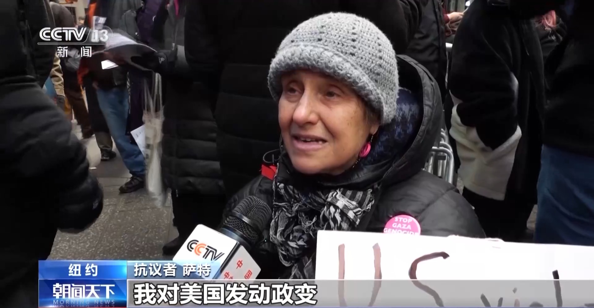 抗议者 萨特:我对美国发动政变,违反国际法的行为感到极度震惊,一开始美国轰炸船只,杀害平民,然后直接派去军舰,闯入他国,把一位总统带走,美国没有任何权利这么做。
