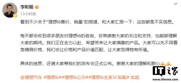 IT之家 9 月 1 日消息,理想汽车产品线负责人李昕旸昨晚发文,称看到不少关于“理想 i6 售价、销量”的报道,这些都是不实信息。具体的信息,还请大家等发布会正式公布。