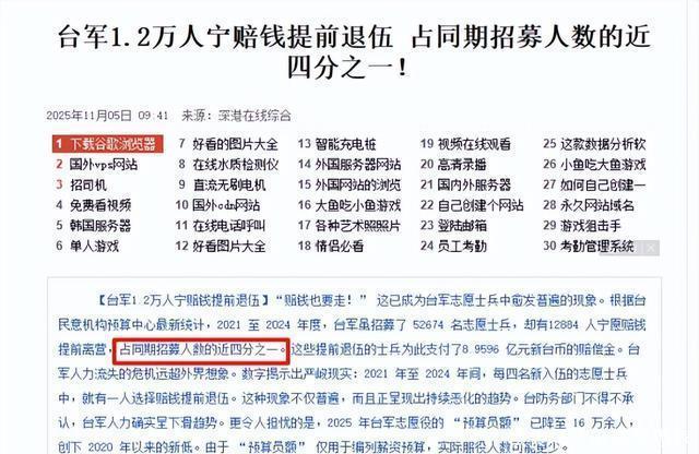新兵就更加夸张了,新兵才三个月就要走的比例也不低,招兵这事儿早就不是新闻了,每年都不达标,现在连最基本的战斗力都维持不了。 士兵们肚里清清楚楚,谁愿意去为那场毫无意义的“TD”闹剧卖命? 这几年台当局把士兵当耗材,说是保卫家园,福利保障却在砍,退伍待遇一降再降,年轻人入伍本来图的就是安稳,现在连后路都被堵上了。