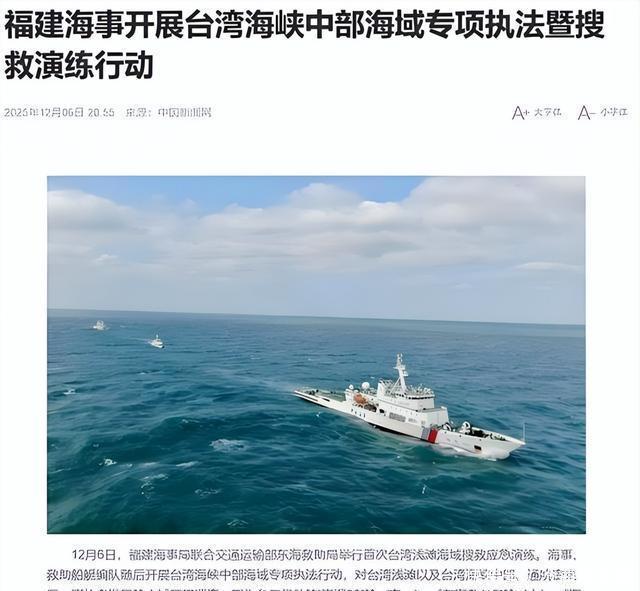 首进台浅滩演练 12月6日,福建海事局还有东海救助局没有提前打声招呼,就在台湾浅滩海域做起了搜救应急方面的演习动作。 “海巡06”轮当先,四艘船加上三架无人机,一共一百零四人,这阵容代表的就是运输船船艏着火,有人掉水里的那种真实紧急状况,实实在在操练了事故发生通知,船舶灭火,人员营救这类硬碰硬的科目。